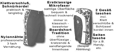 • Seestern Surfshorts, in klassisch bewährter Boardshort Tradition, d.h. ohne unkomfortabler-, Sand fangender-, und optisch überflüssiger Innenhose ('Sichtschutz' bei einer Shorts Länge von ca.53(XS) - 57(3XL) cm ist gegeben :-)
